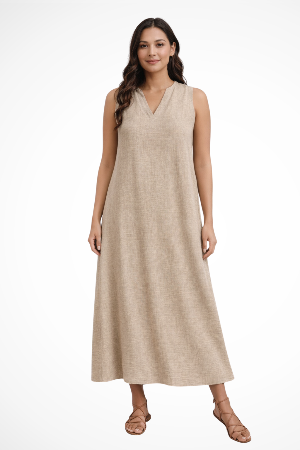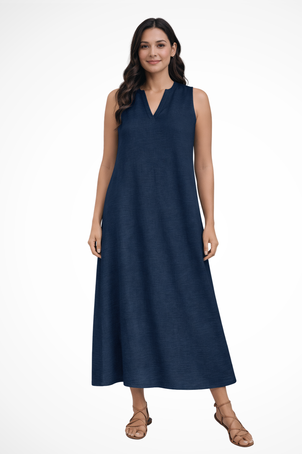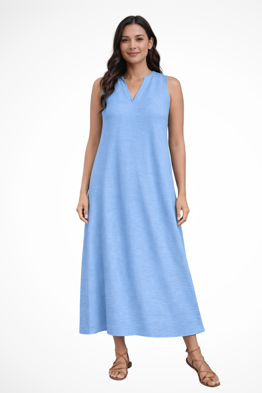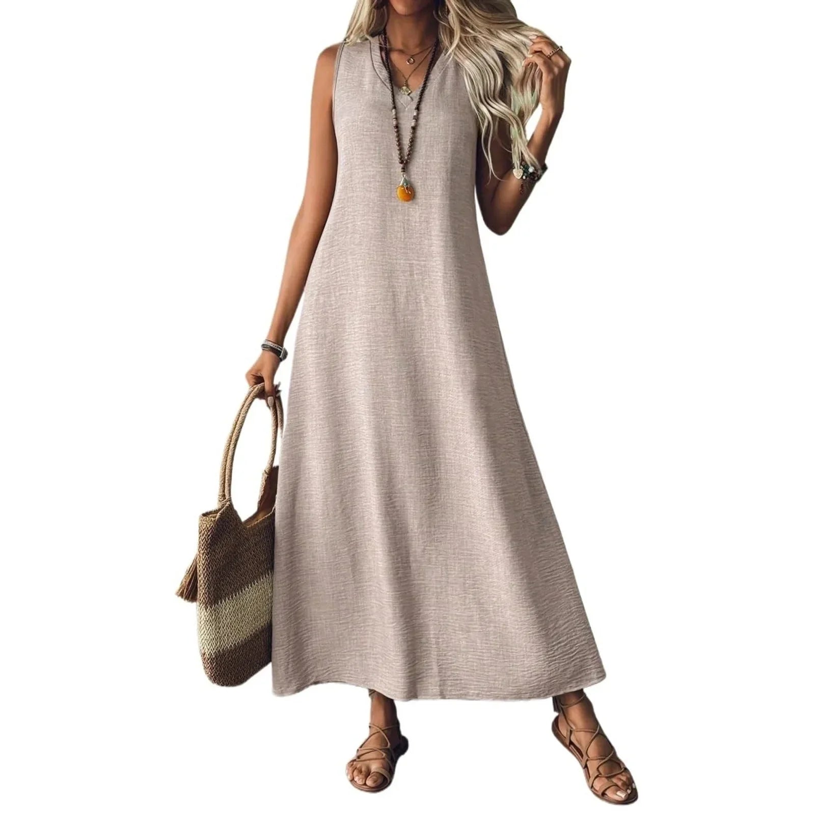 This sleeveless maxi dress is designed with a simple V-shaped neckline and a loose, flowing silhouette that extends to ankle length. The shape falls smoothly from the shoulders, creating a straight, uninterrupted line through the body. With no visible fastenings or added detailing, the focus remains on the clean cut and full-length drape. It can be worn with flat sandals or low-profile footwear for warm-weather settings and casual daytime plans.
