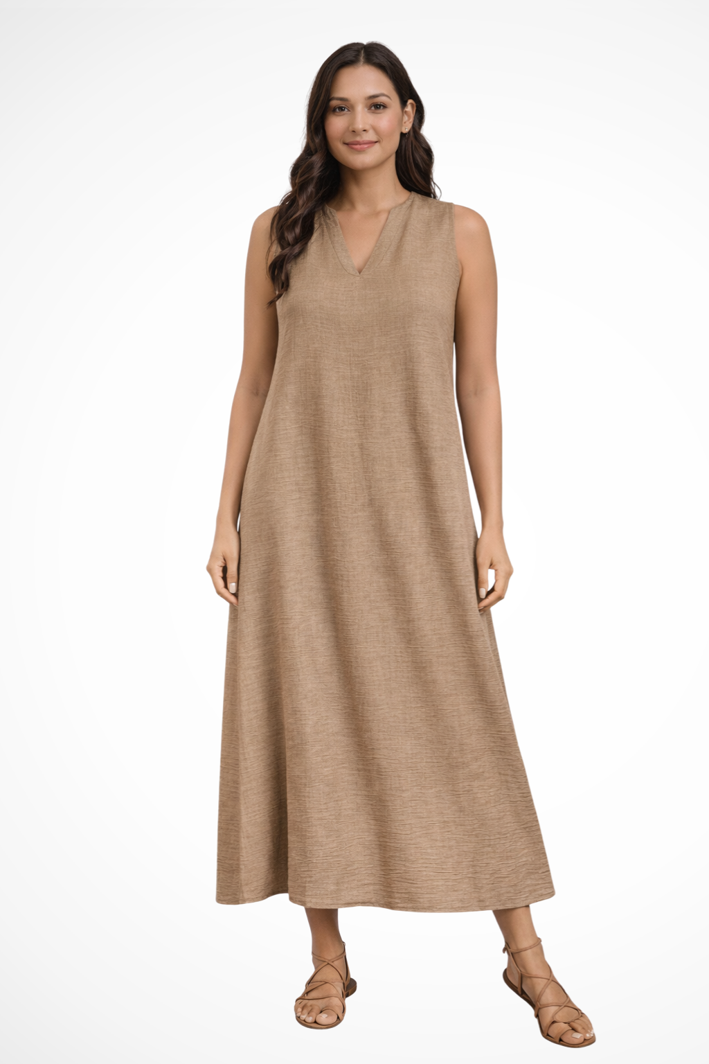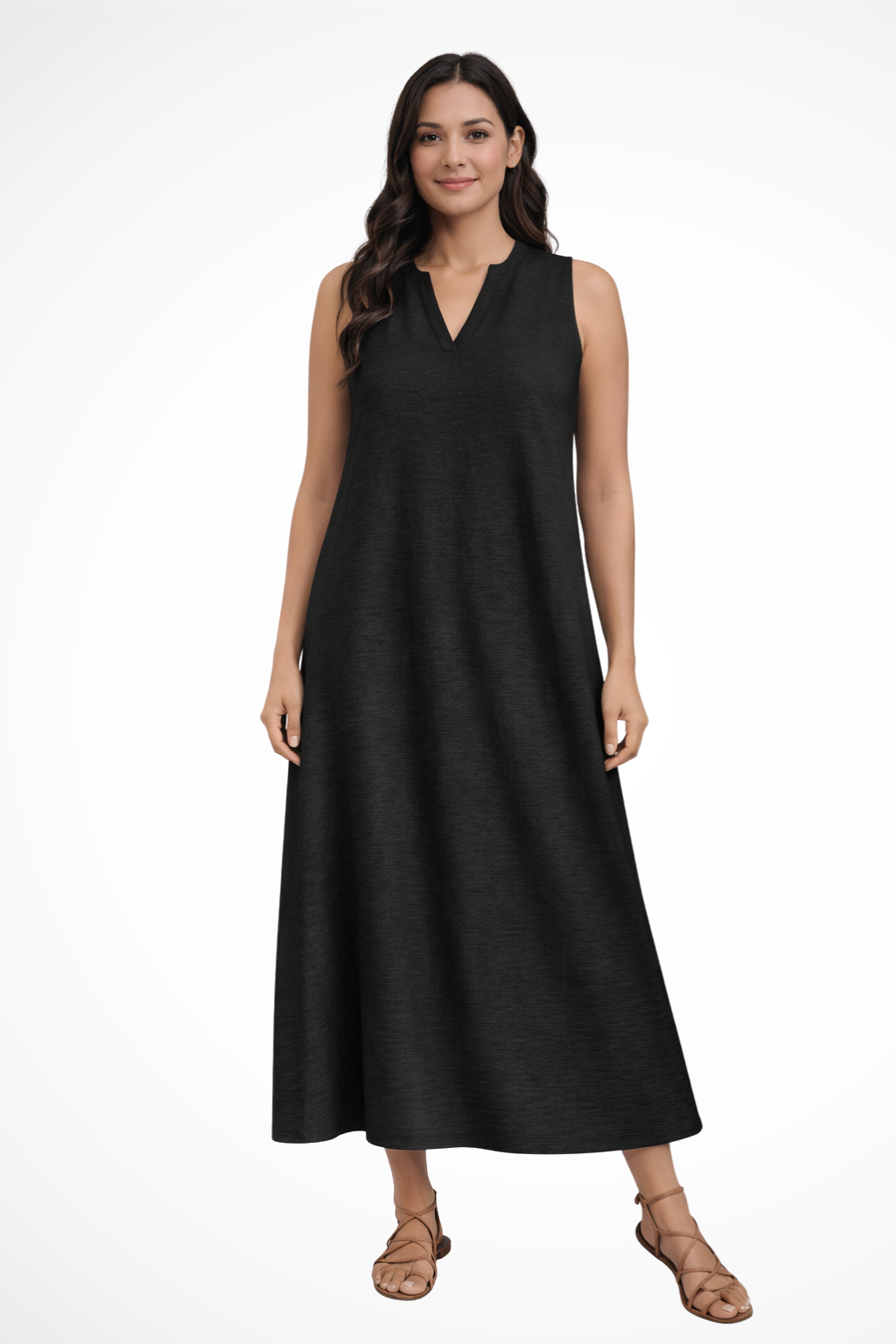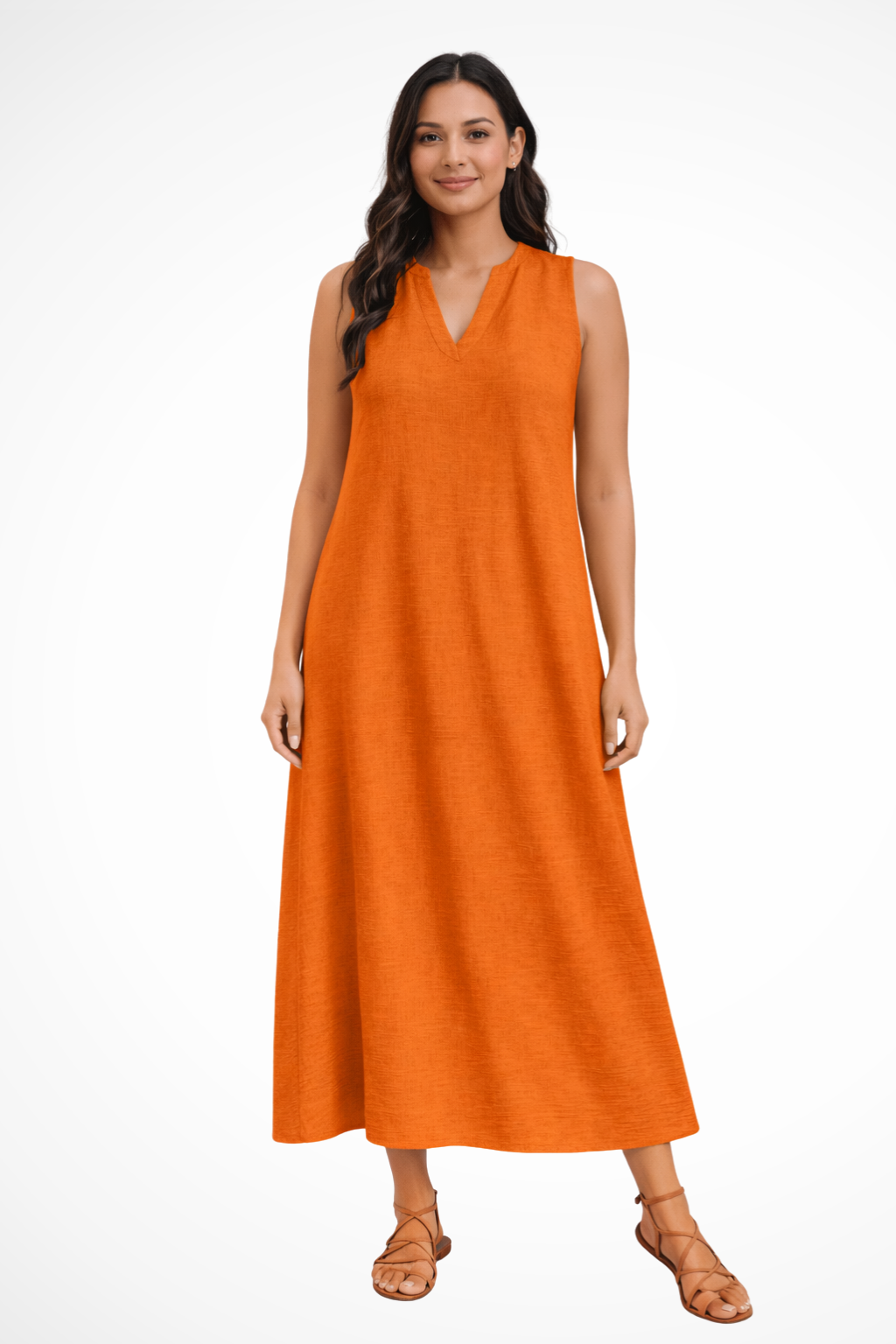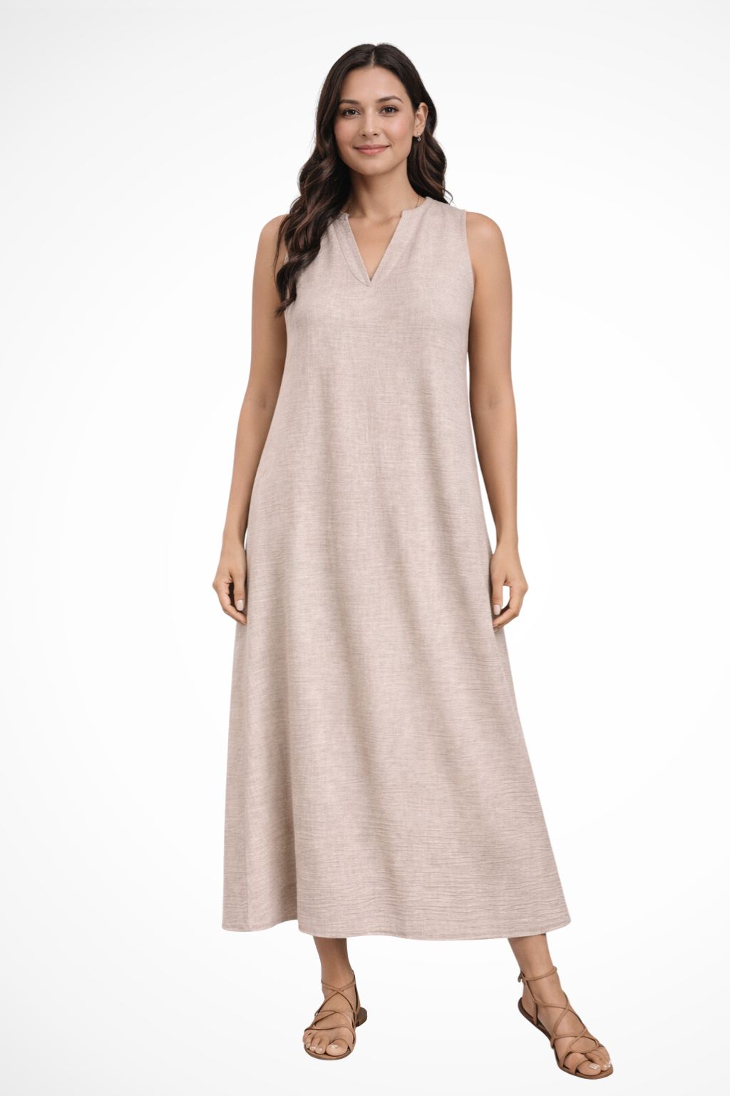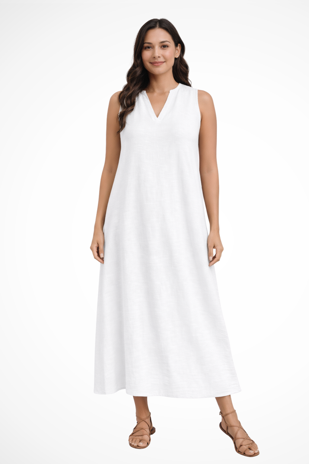 This sleeveless maxi dress is designed with a simple V-shaped neckline and a loose, flowing silhouette that extends to ankle length. The shape falls smoothly from the shoulders, creating a straight, uninterrupted line through the body. With no visible fastenings or added detailing, the focus remains on the clean cut and full-length drape. It can be worn with flat sandals or low-profile footwear for warm-weather settings and casual daytime plans.