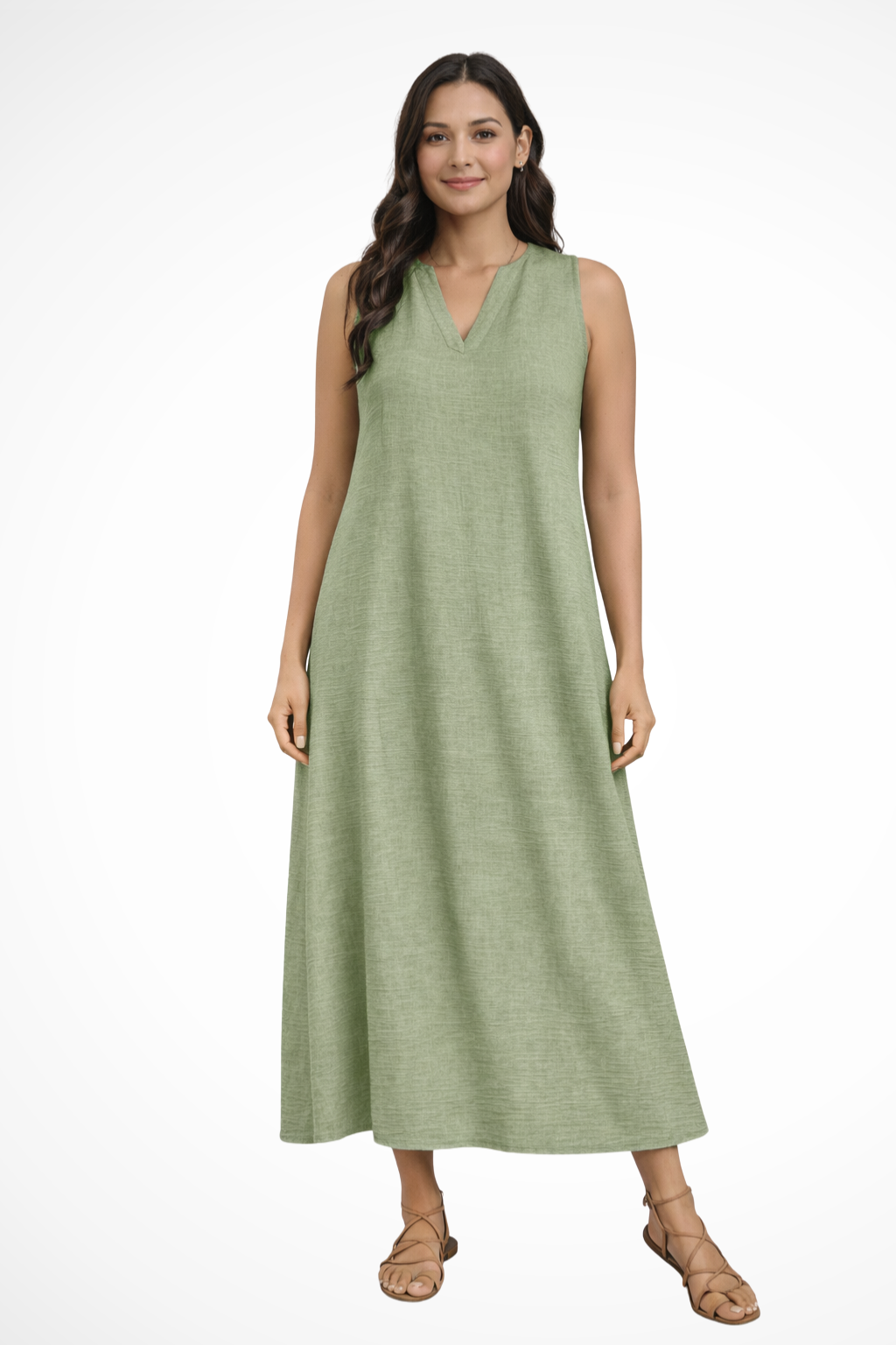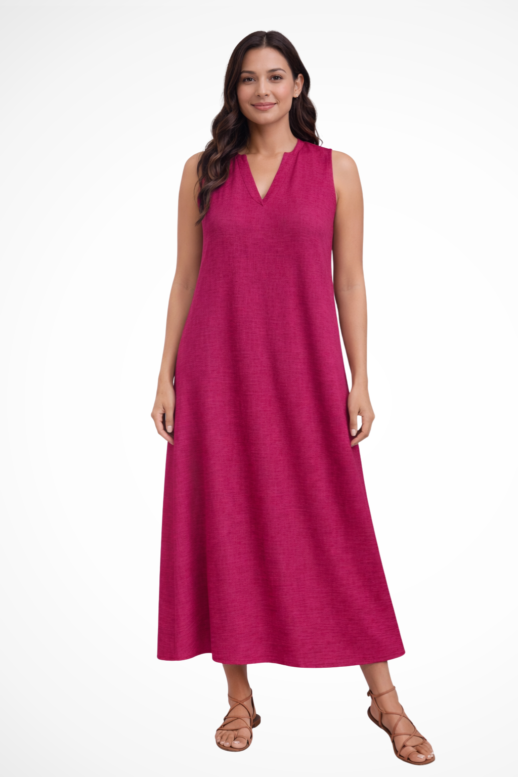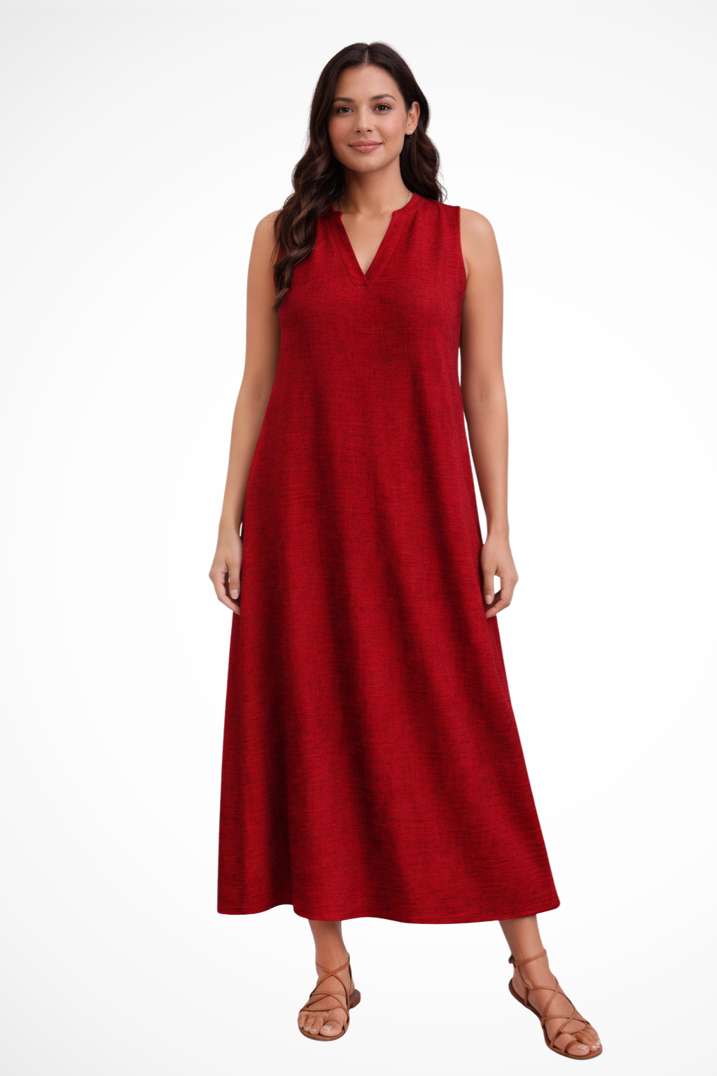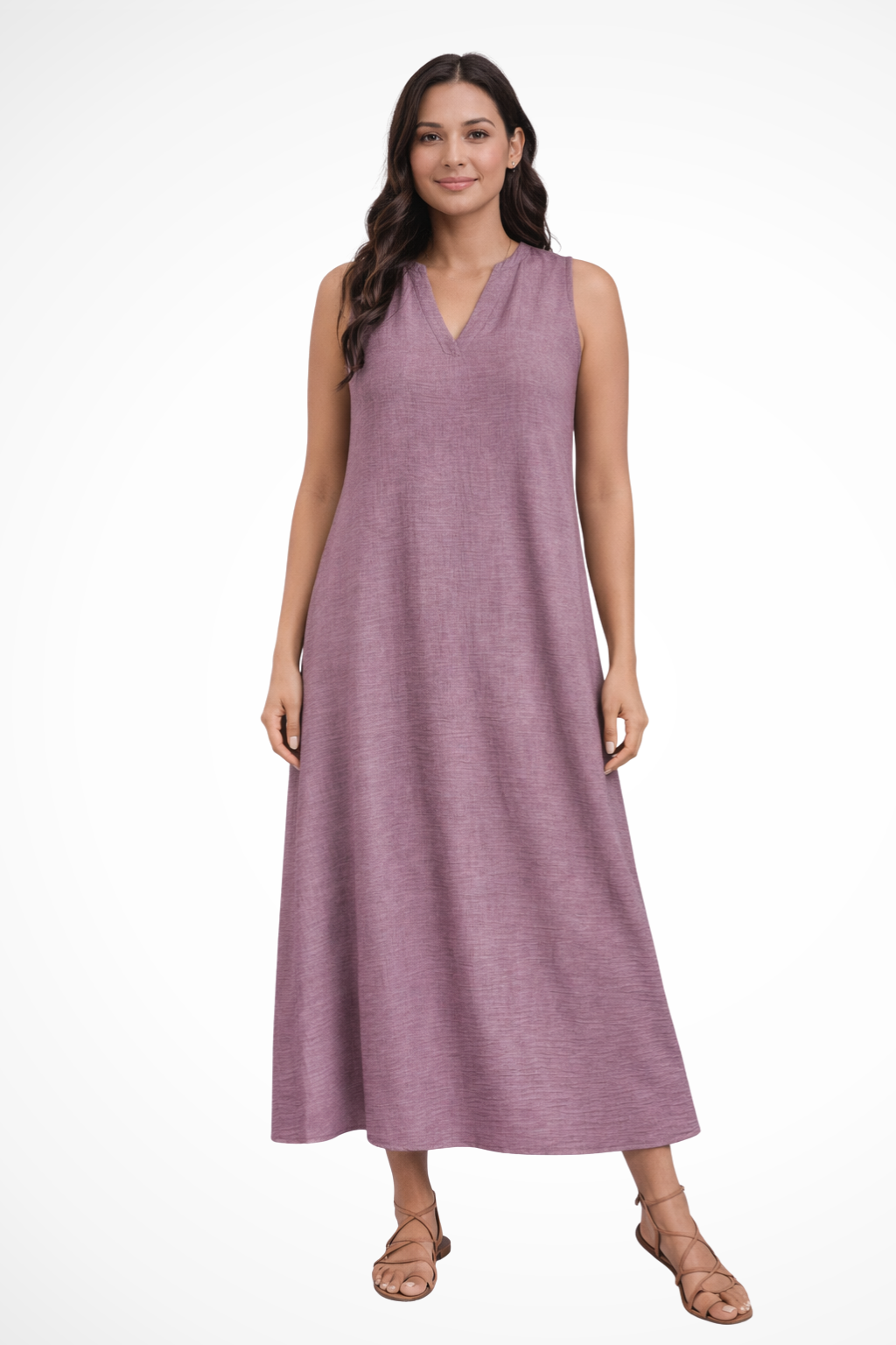 This sleeveless maxi dress is designed with a simple V-shaped neckline and a loose, flowing silhouette that extends to ankle length. The shape falls smoothly from the shoulders, creating a straight, uninterrupted line through the body. With no visible fastenings or added detailing, the focus remains on the clean cut and full-length drape. It can be worn with flat sandals or low-profile footwear for warm-weather settings and casual daytime plans.