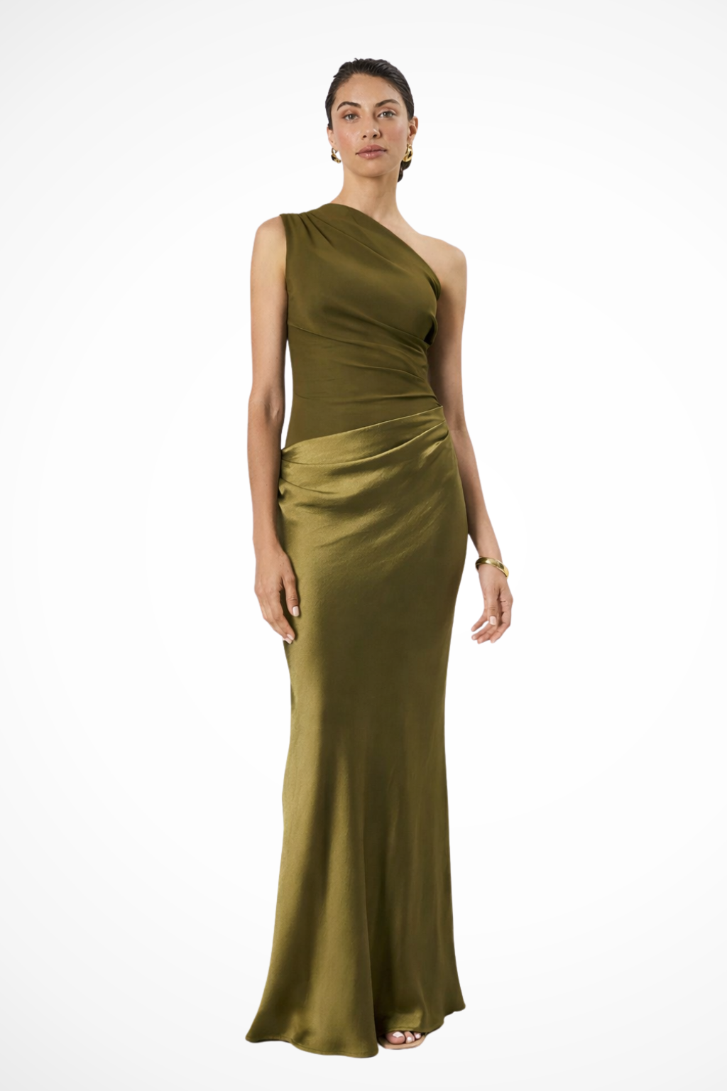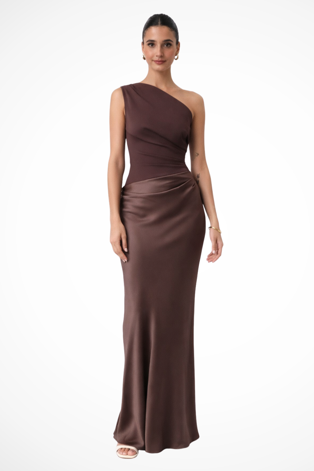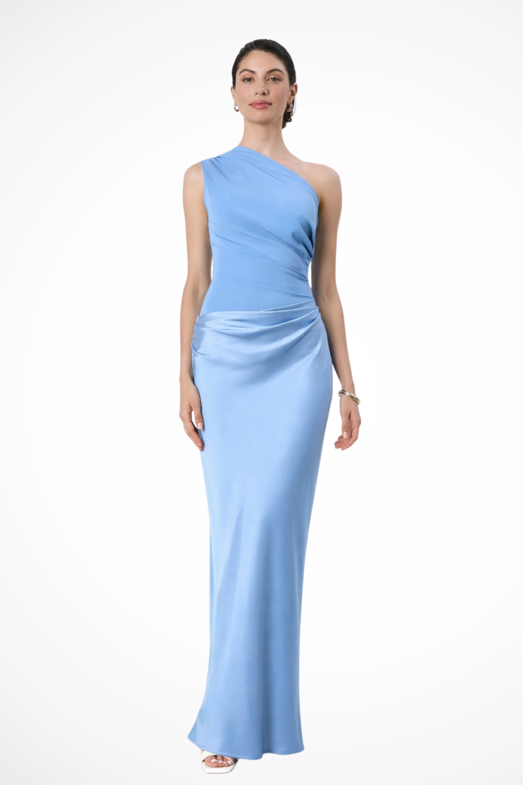 This elegant women’s maxi dress features a sleek one-shoulder neckline with soft, asymmetrical draping across the bodice. The fitted upper section gently contours the waist, while the long skirt falls smoothly to the floor with a fluid, lightly lustrous finish. Subtle gathers at the hip add dimension and movement, creating a refined silhouette that feels modern and effortless.