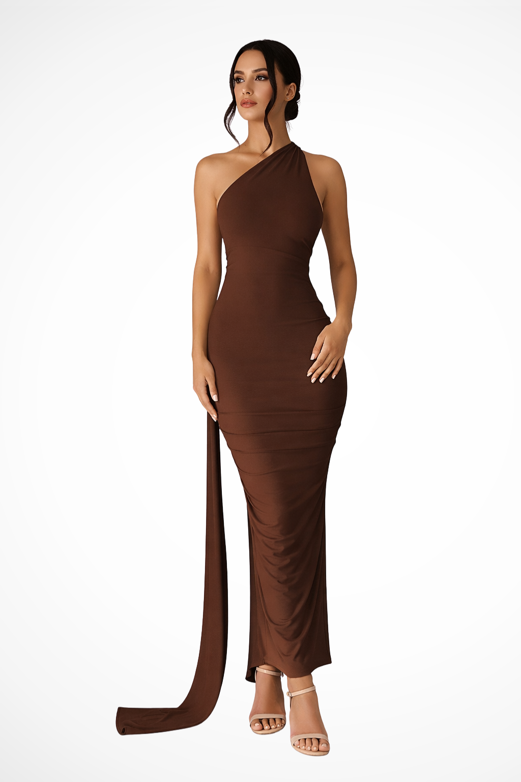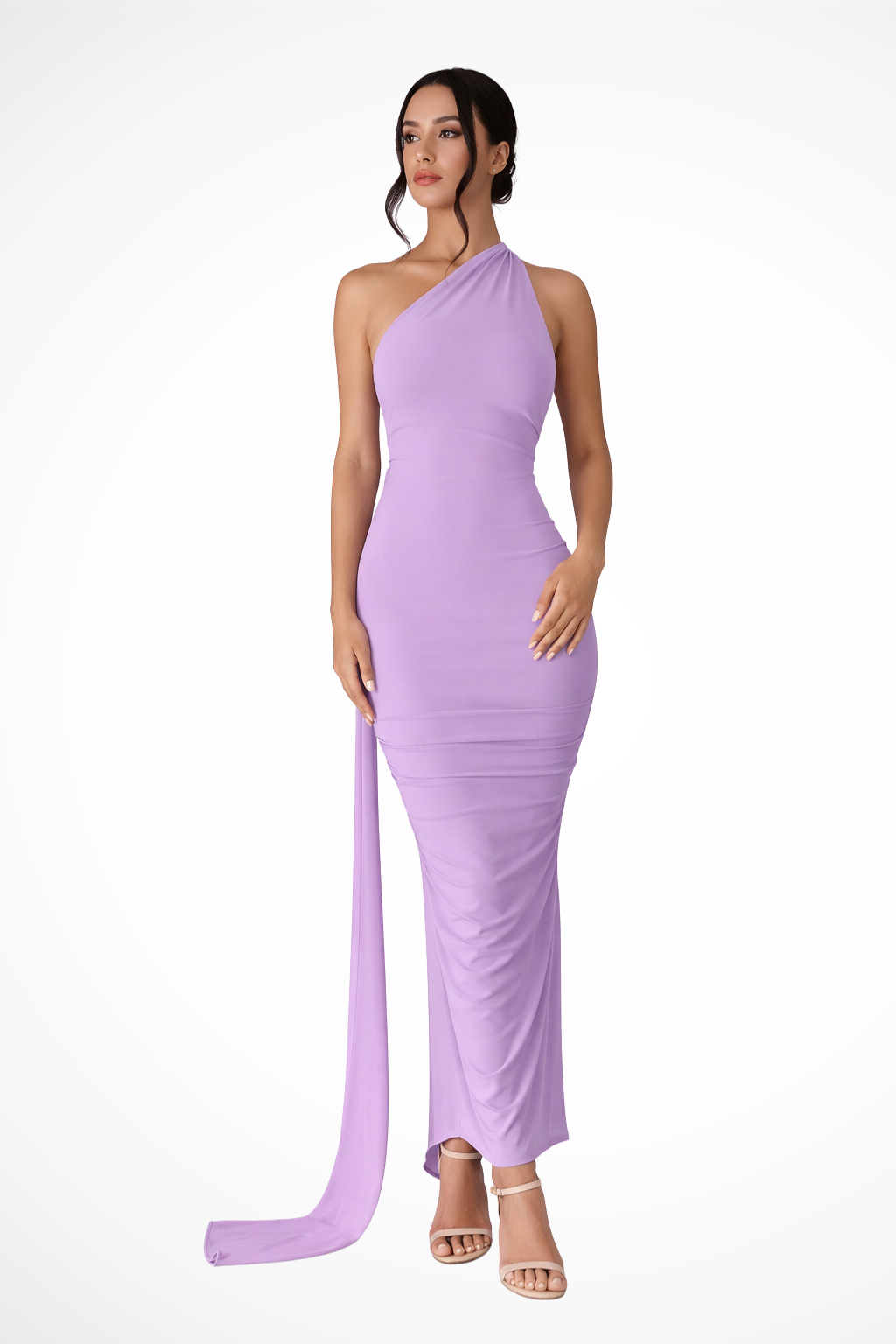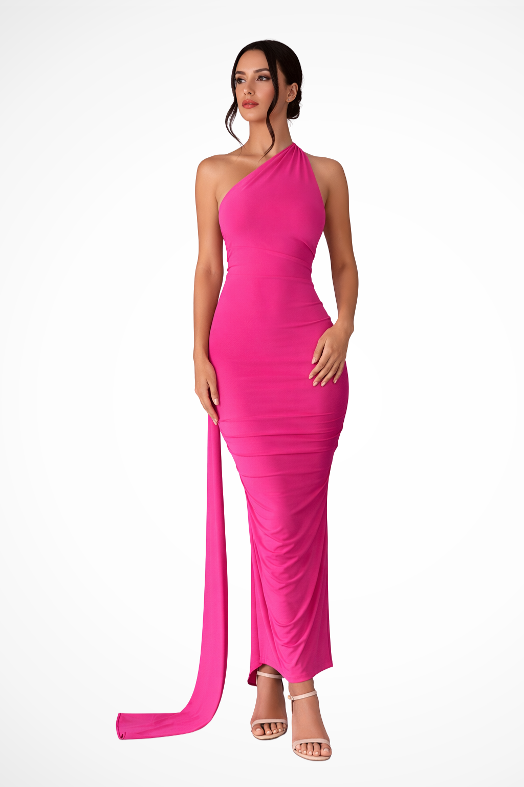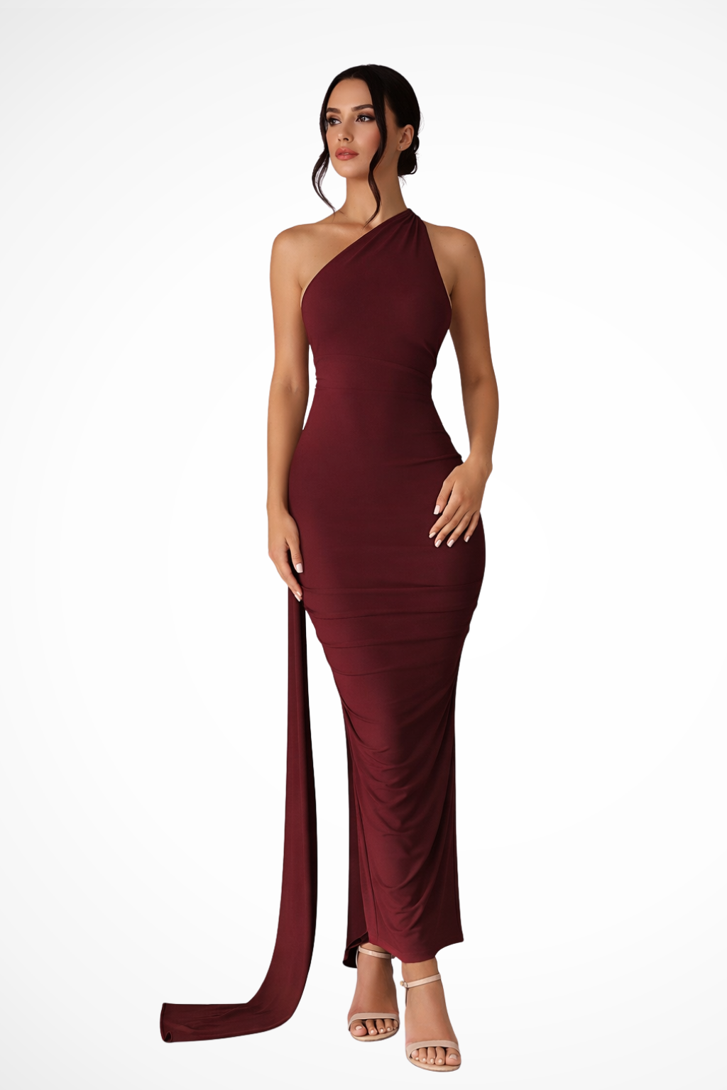 This full-length dress is designed with a single shoulder strap and an asymmetrical neckline that frames the upper body. Ruched detailing is concentrated around the waist and hip area, creating soft gathers that shape the silhouette. The skirt falls to a maxi length with a straight, elongated line, while a draped fabric panel extends from the shoulder down the back, adding fluid movement. The sleeveless design leaves one shoulder fully exposed, emphasising the asymmetrical construction.