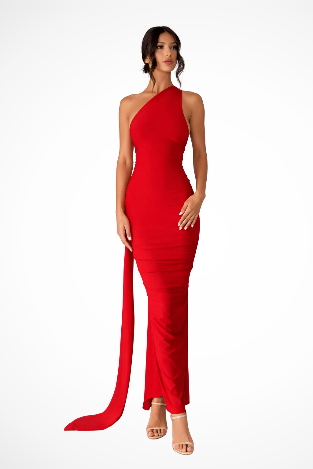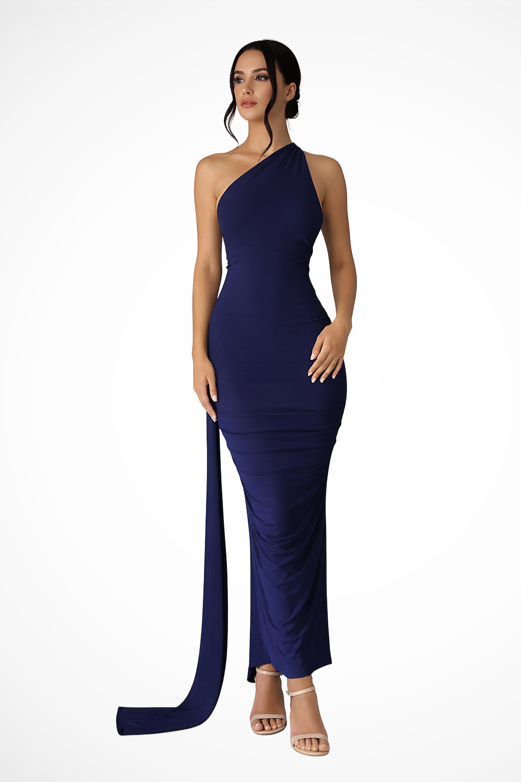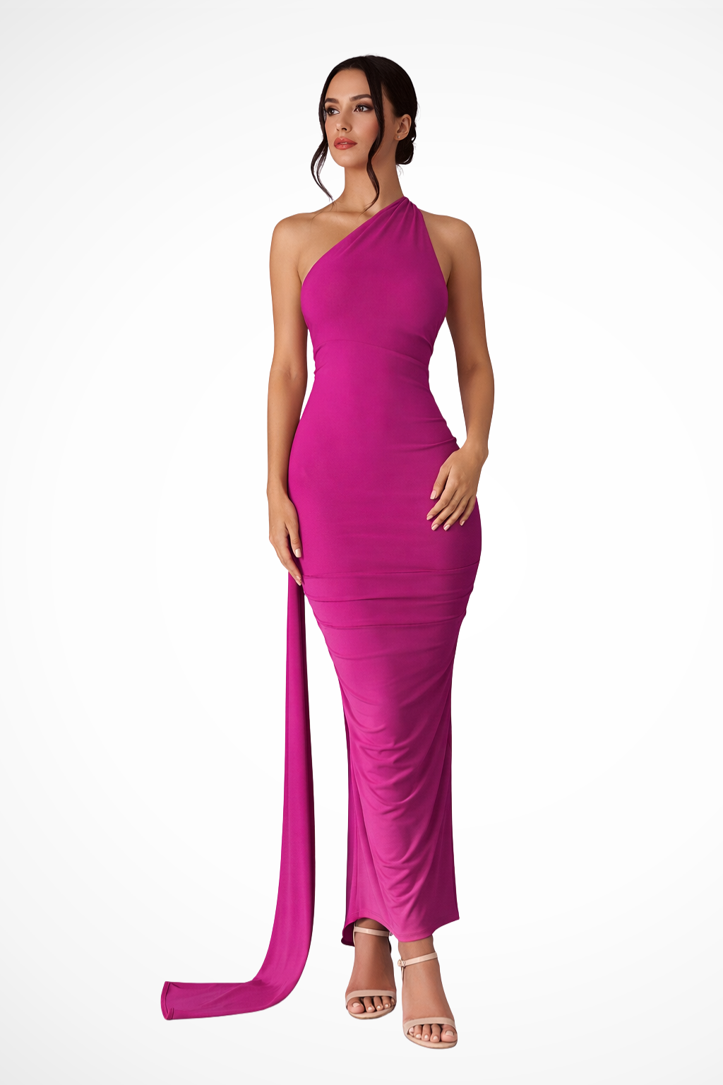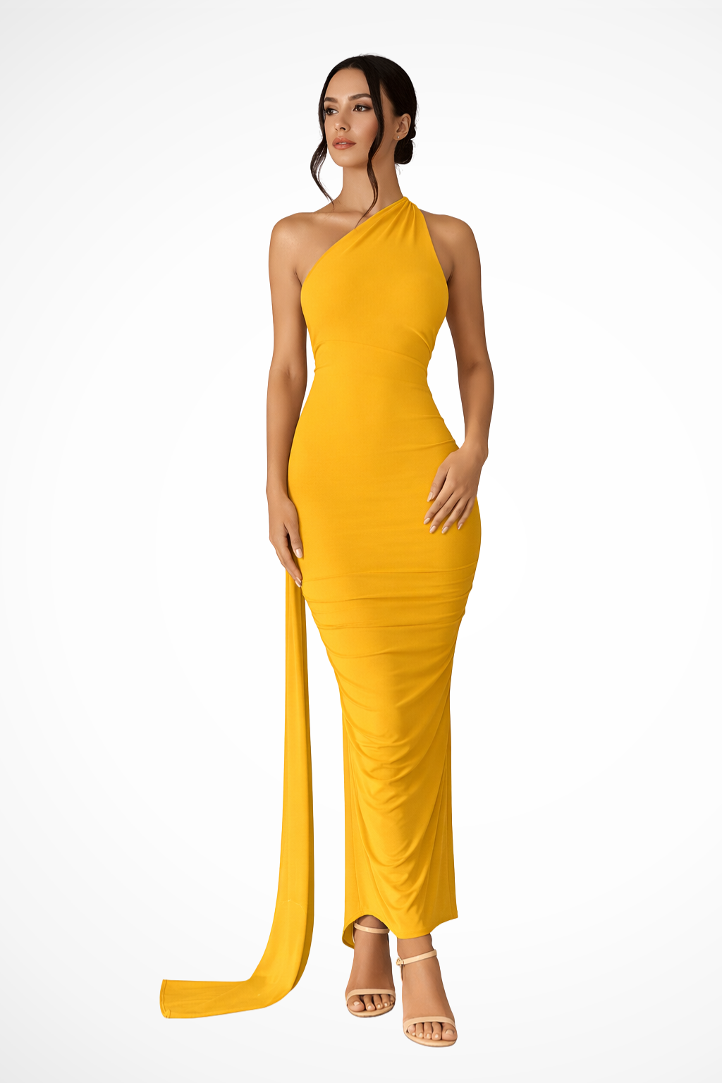 This full-length dress is designed with a single shoulder strap and an asymmetrical neckline that frames the upper body. Ruched detailing is concentrated around the waist and hip area, creating soft gathers that shape the silhouette. The skirt falls to a maxi length with a straight, elongated line, while a draped fabric panel extends from the shoulder down the back, adding fluid movement. The sleeveless design leaves one shoulder fully exposed, emphasising the asymmetrical construction.