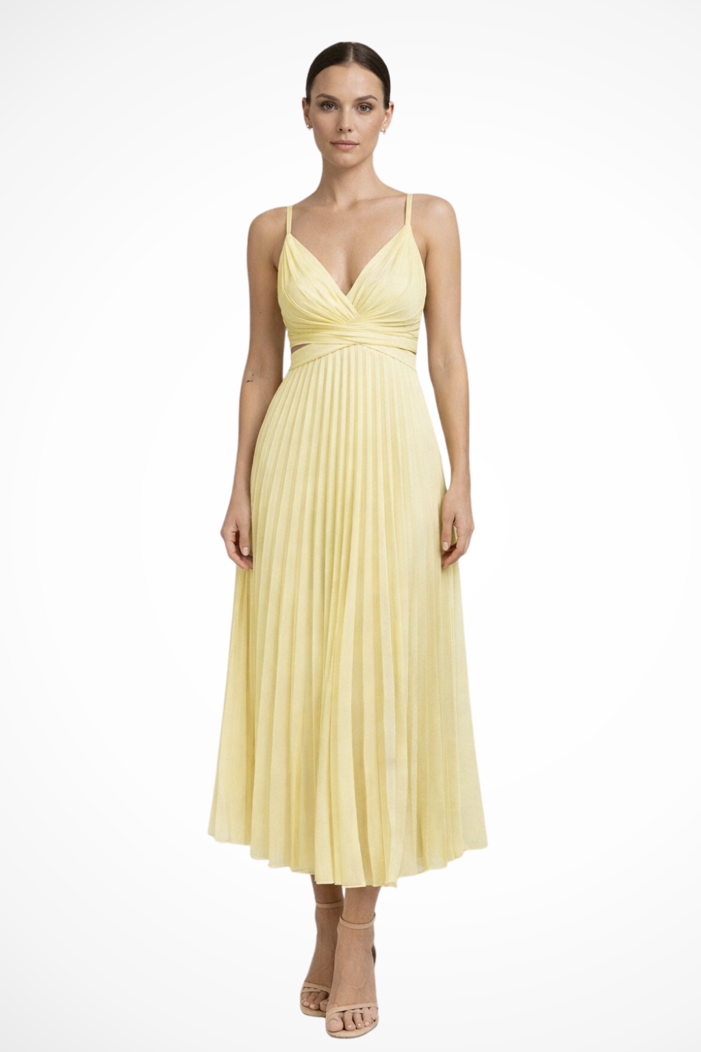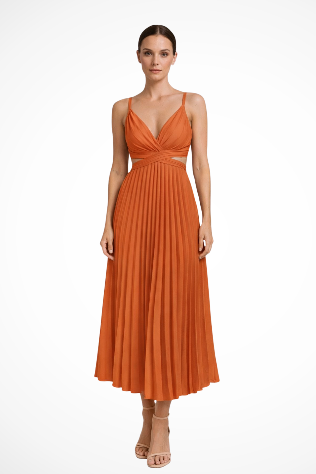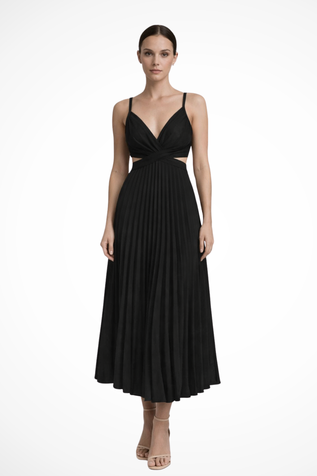 This women’s midi dress features a twist-front bodice with a V neckline and wide shoulder straps. The fitted upper section transitions into a fully pleated skirt that creates a structured A-line silhouette from waist to hem. The side cut-out detail sits just below the bust, adding a defined break in the shape without altering the overall flow of the skirt. Suitable for formal and occasion wear, the design pairs well with understated accessories.