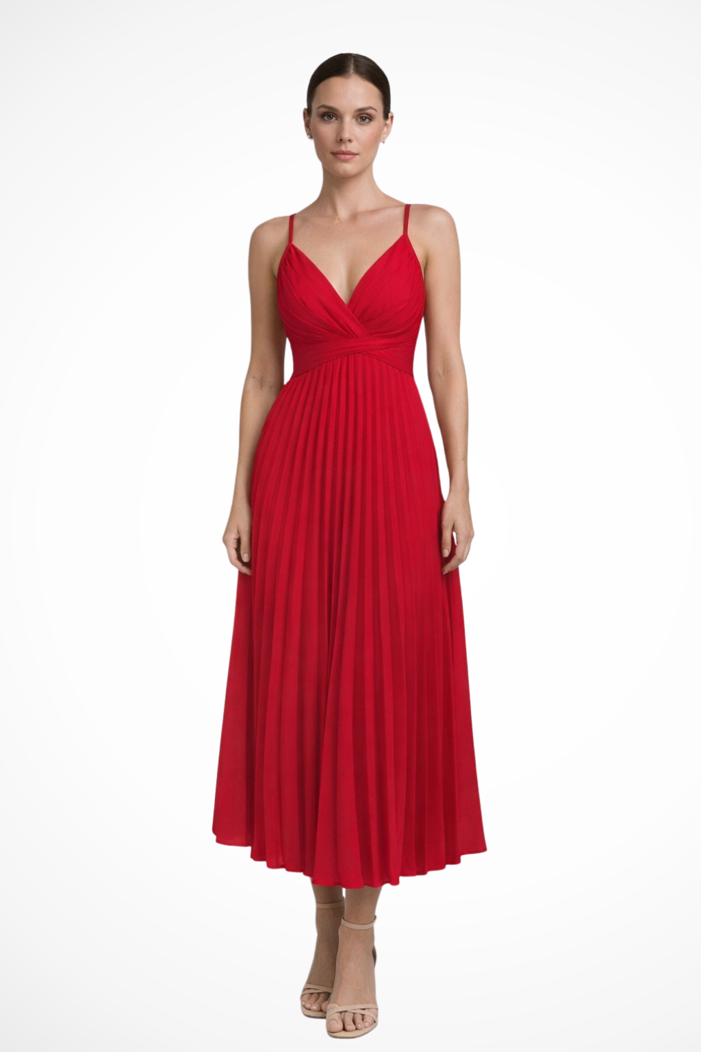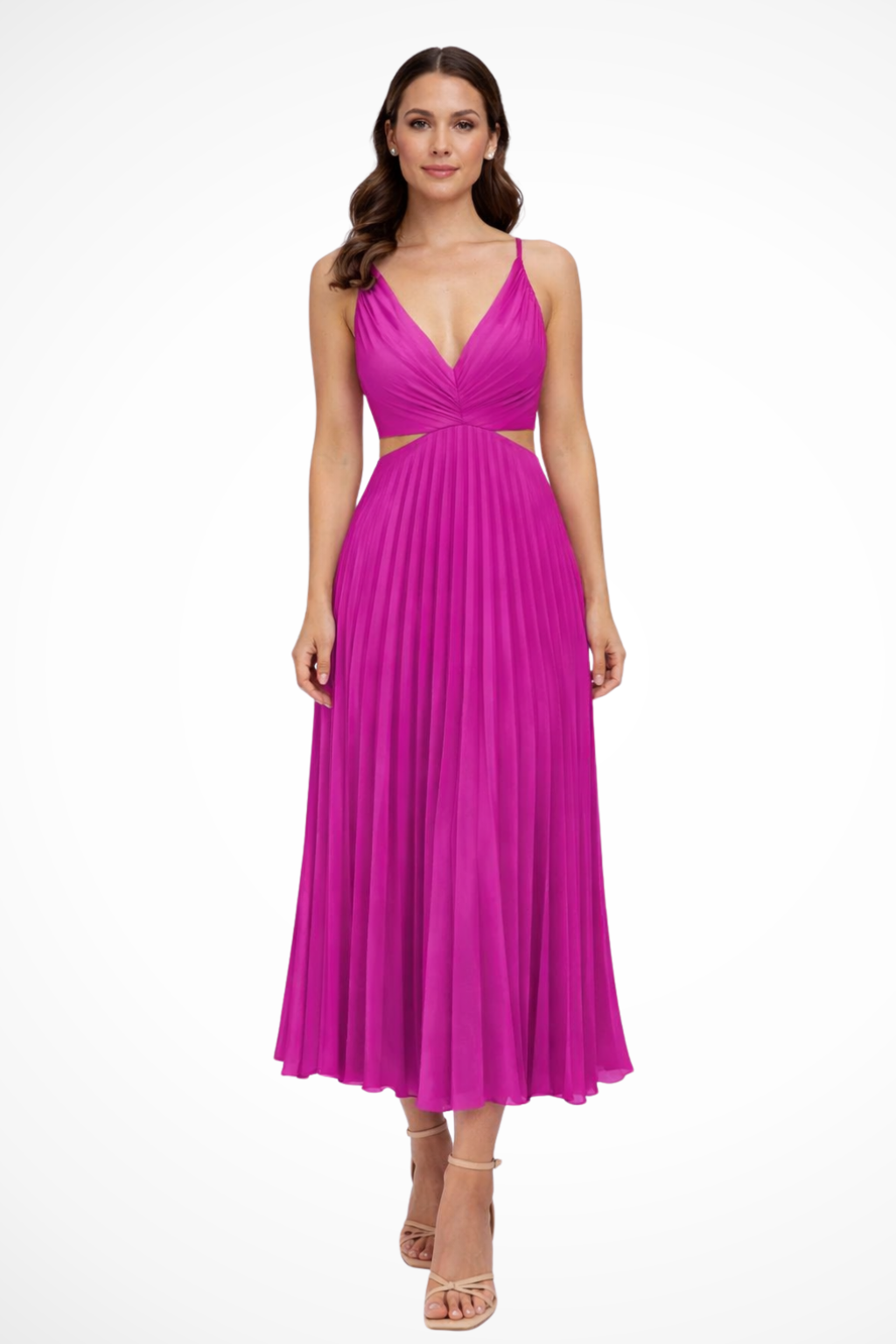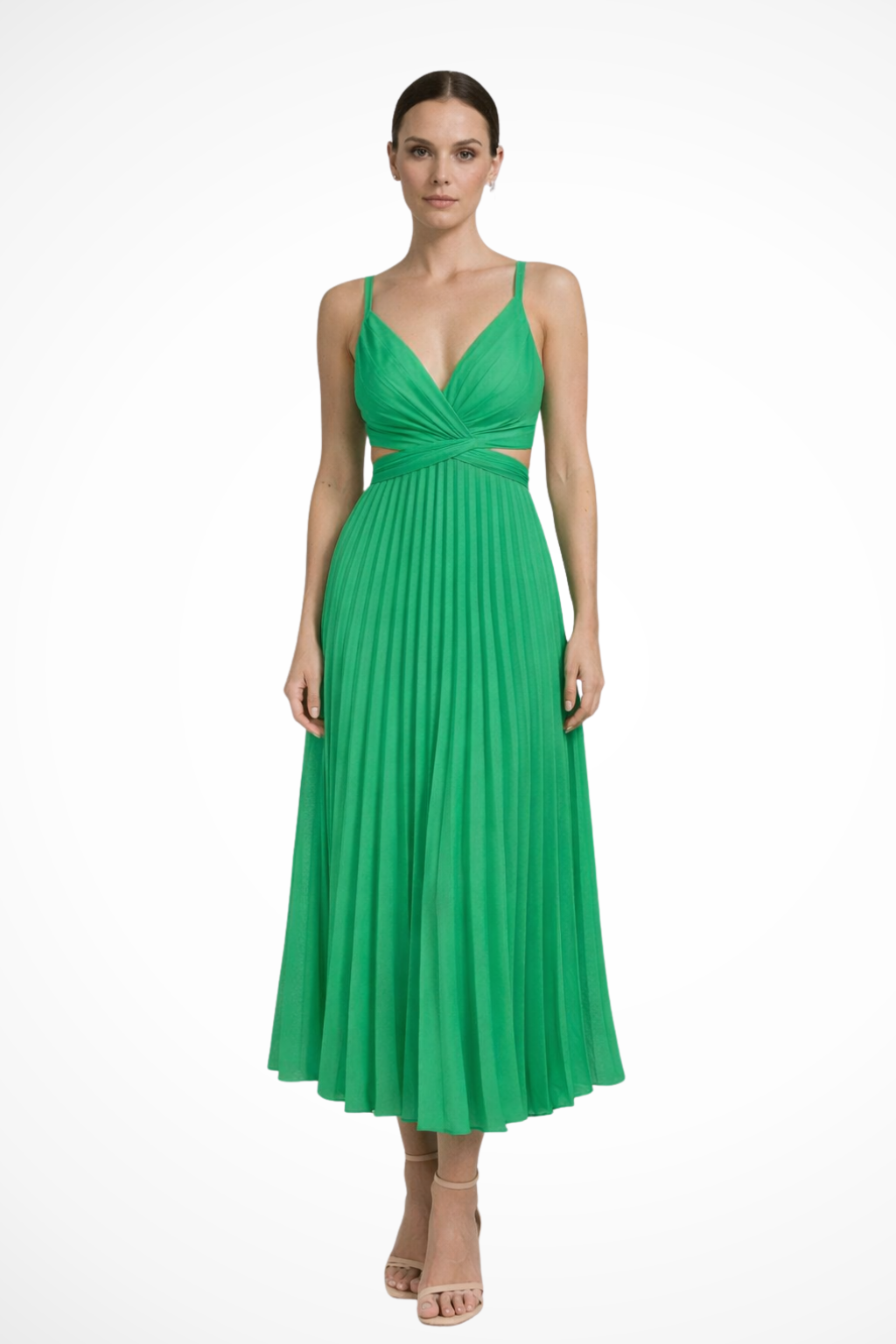 This women’s midi dress features a twist-front bodice with a V neckline and wide shoulder straps. The fitted upper section transitions into a fully pleated skirt that creates a structured A-line silhouette from waist to hem. The side cut-out detail sits just below the bust, adding a defined break in the shape without altering the overall flow of the skirt. Suitable for formal and occasion wear, the design pairs well with understated accessories.